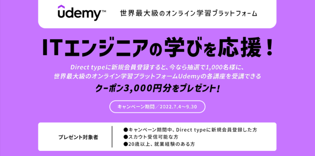 これを記念して、7月から9月の間に新規会員登録いただいた方を対象に「Udemyクーポン3000円分プレゼントキャンペーン」を実施いたします。また「追いかけるより追いかけられる転職を。」をキャッチコピーとした宣伝広告を7月中旬より開始。ITエンジニア向けのダイレクトリクルーティングサービスとしてDirect typeの認知を広げていきます。