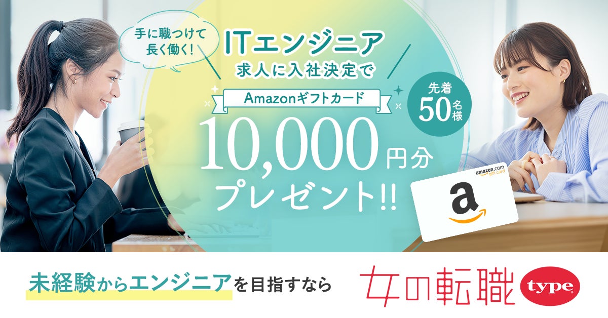 株式会社キャリアデザインセンター(本社:東京都港区 代表取締役社長兼会長:多田 弘實)が運営する、正社員で長く働きたい女性のための転職サイト『女の転職type』は、スキルを身につけたい女性に向けて、ITエンジニア転職を応援するキャンペーンを実施します。女の転職typeに掲載中のITエンジニア系求人(※)に応募し、入社決定で10,000円分のAmazonギフトカードプレゼント!