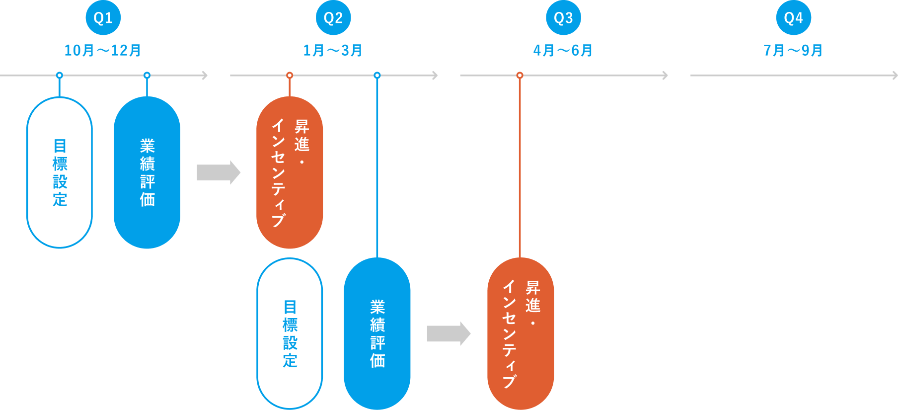 Q(クォーター)毎に、業績などの評価により昇進・昇格の機会があります。