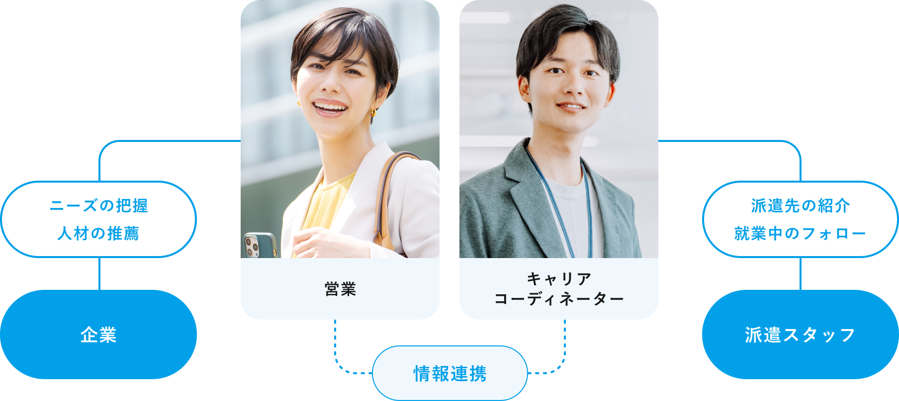 派遣スタッフの業務内容や職場環境にあわせて、気持ちよく働けるようにサポートします。