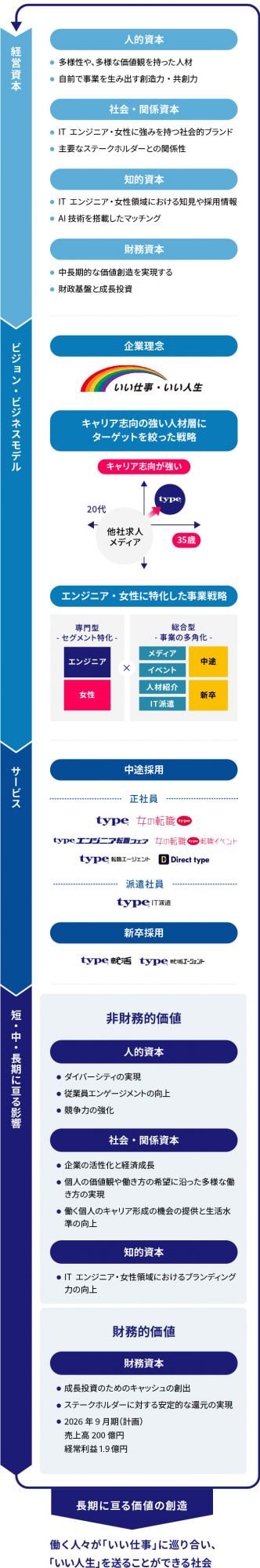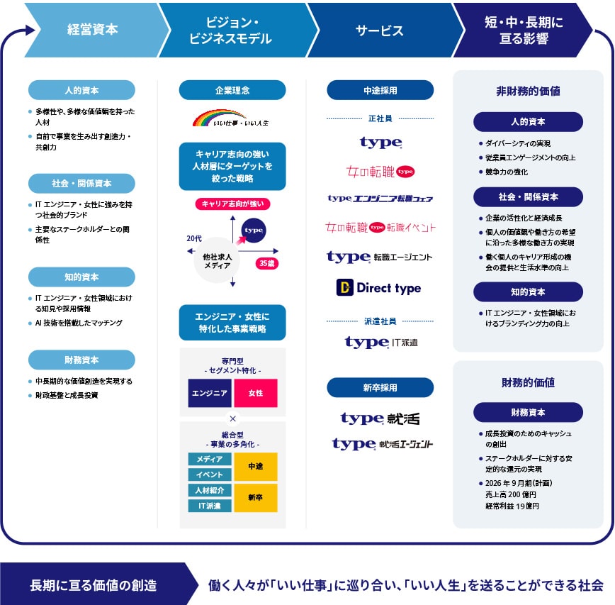 私たちは、人材の雇用という側面から、“働く人々が「いい仕事」に巡り合い、「いい人生」を送ることができる社会”の実現を目指しています。働く人々がより豊かな人生を歩めるようにキャリアの選択から支援をし、適正な企業統治のもと、社会から信頼される企業として、事業を通じて「社会価値」と「経済価値」の双方を創出し、持続可能な社会への貢献と企業価値の向上を追求します。